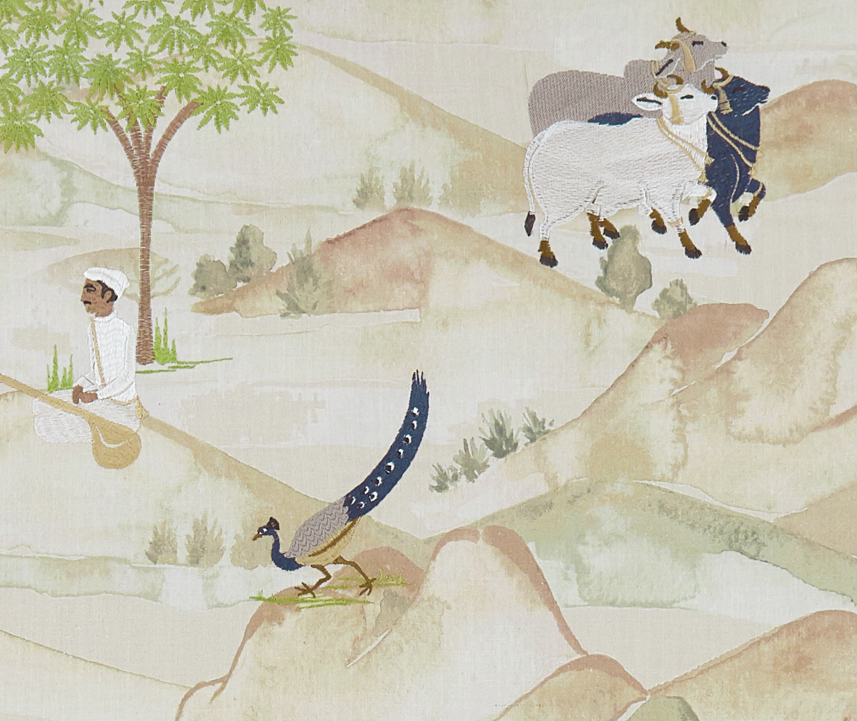 Mooie decoratiestof met geborduurde motieven. De stof is 131 cm breed. Geschikt voor luxueuze gordijnen en sierkussens.