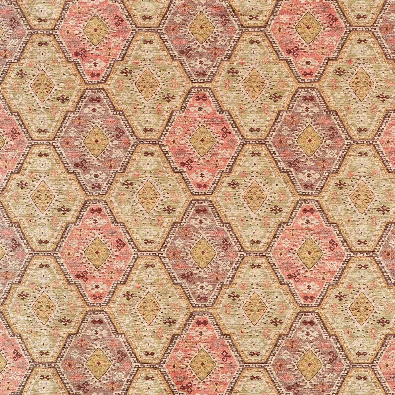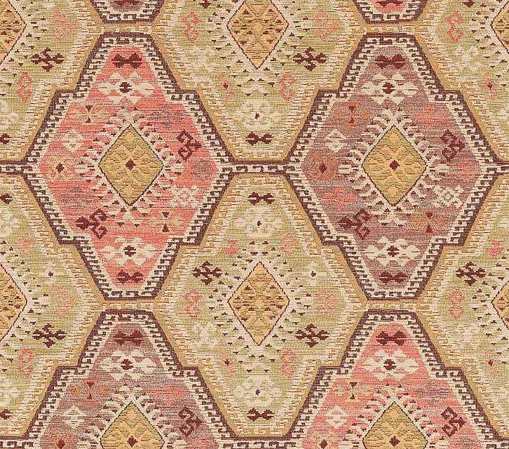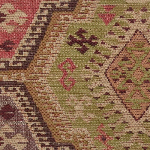 Zware kwaliteit meubelstof geweven met zachte chenille garens. De stof heeft een authentiek kelim patroon. Slijtweerstand 20.000 toeren Martindale. Breedte 140 cm.
