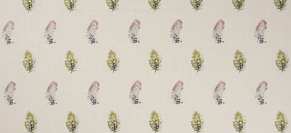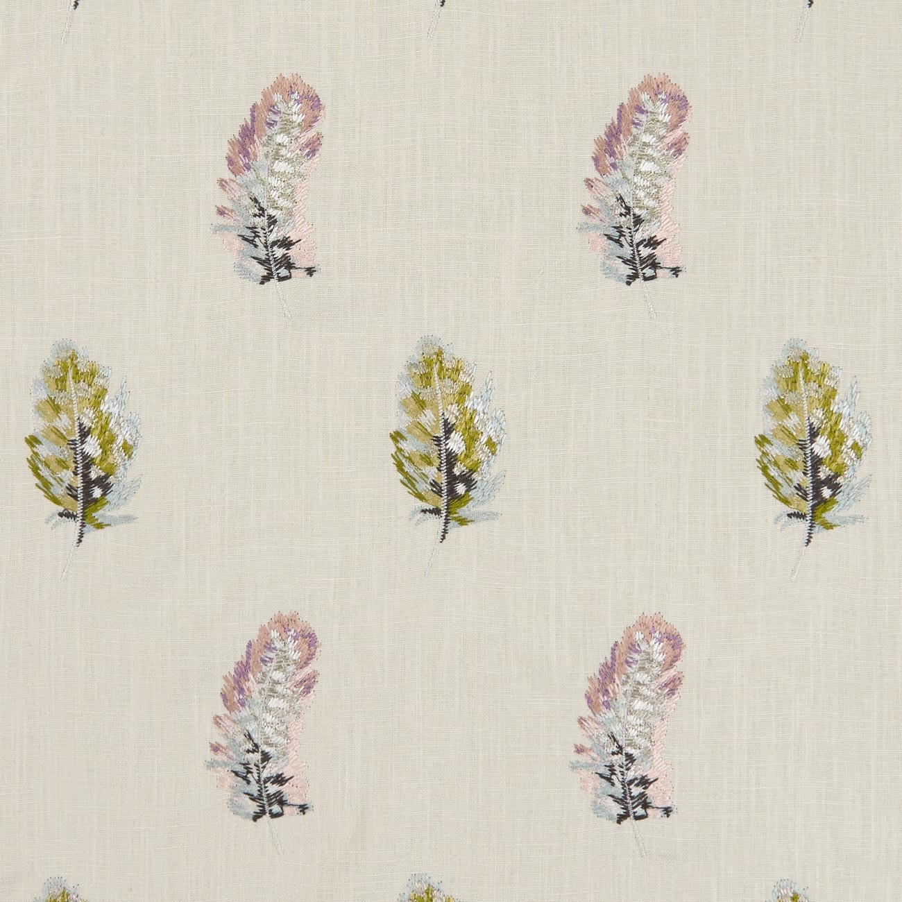 Fijn geweven decoratiestof met geborduurde veren. Breedte 128 cm.