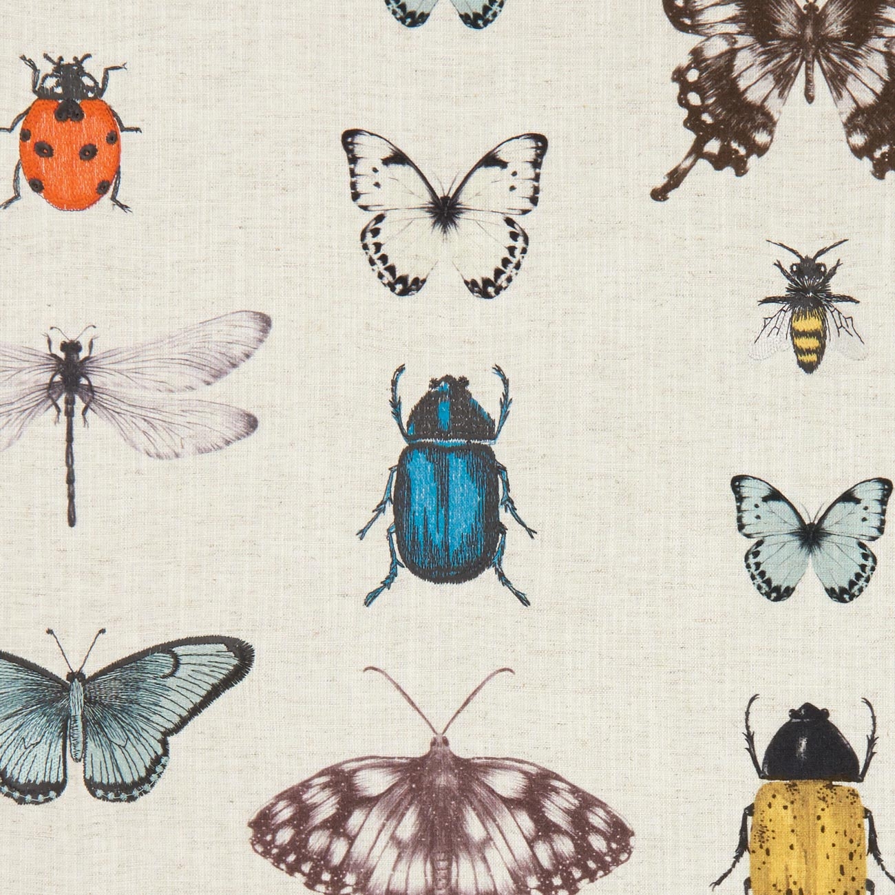 Fijn geweven decoratiestof met geborduurde kevers en vlinders. Breedte 137 cm.